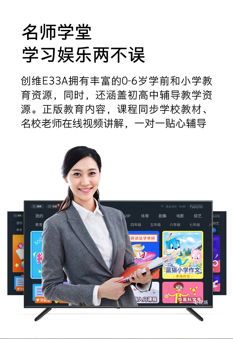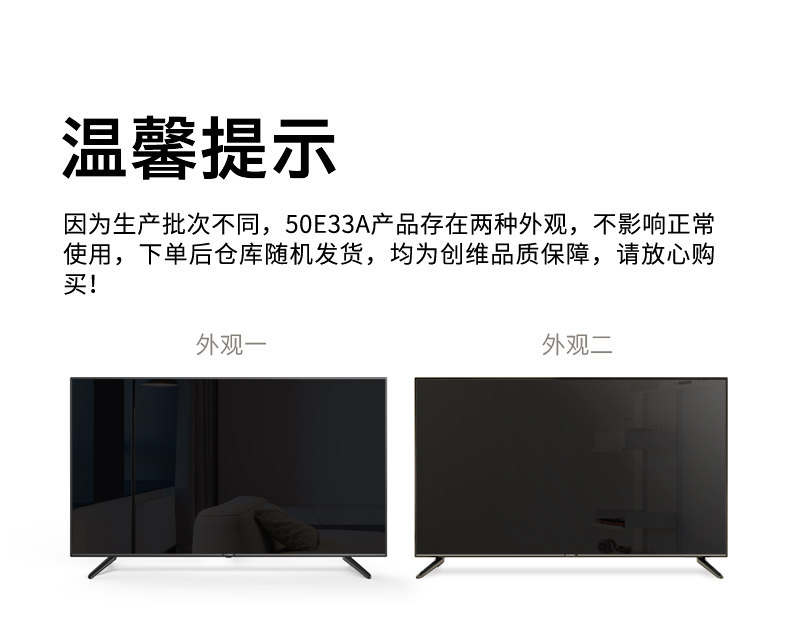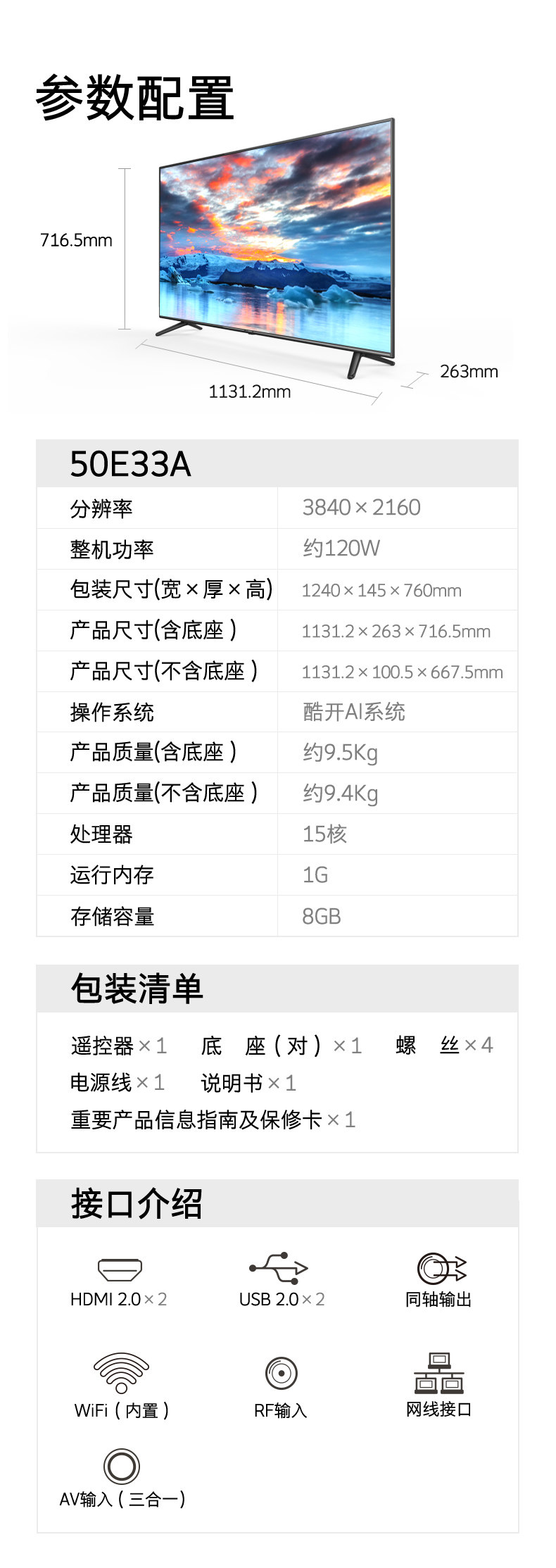 商品属性 [品牌 ] Skyworth/创维 [创维LED型号 ] 50E33A [售后服务 ] 全国联保 [屏幕比例 ] 16:9 [接口类型 ] HDMI,USB,RF输入、视频输入、网络端口 [分辨率 ] 3840×2160 [颜色分类 ] 50E33A,55E33A,65E33A [能效等级 ] 三级 [背光灯类型 ] LED发光二极管 [电视类型 ] LED背光源电视 [网络连接方式 ] 全部支持 [扫描方式 ] 逐行扫描 [接收制式 ] PAL,NTSC [操作系统 ] 酷开系统 [HDMI接口数量 ] 2个 [视频显示格式 ] 2160p [3D类型 ] 无 [主机尺寸(不含底座)mm ] 1131×101×667 [堆码层数极限 ] 3层 [毛重 ] 12.5kg [包装尺寸 ] 1240x145x760mm [上市时间 ] 2019-04 [屏幕尺寸 ] 50英寸 [净重(不含底座) ] 9.4kg [含边框整屏尺寸 ] 1131x101x667mm [净重(含底座) ] 9.5kg [能效备案号 ] 201903-22-601-3564783908284 [电视形态 ] 平板 [保修期 ] 12个月