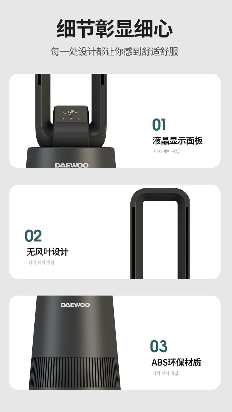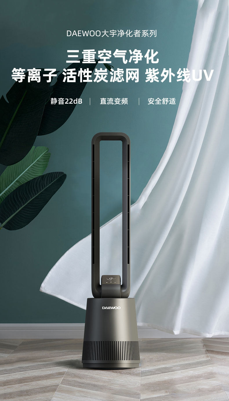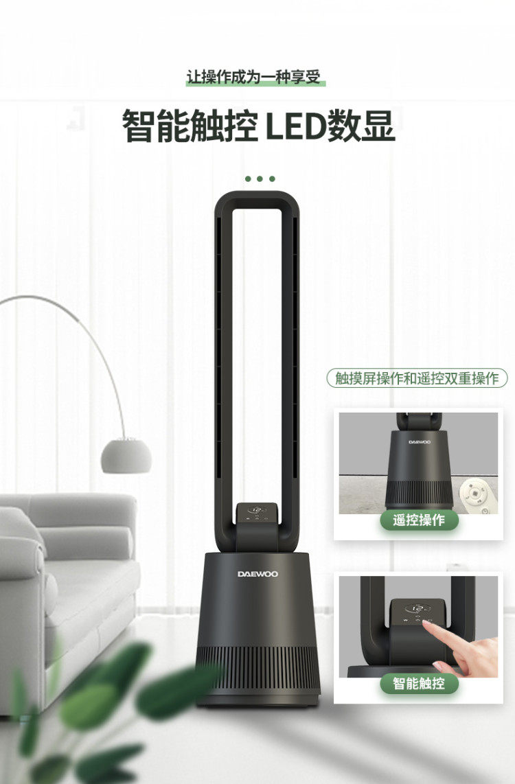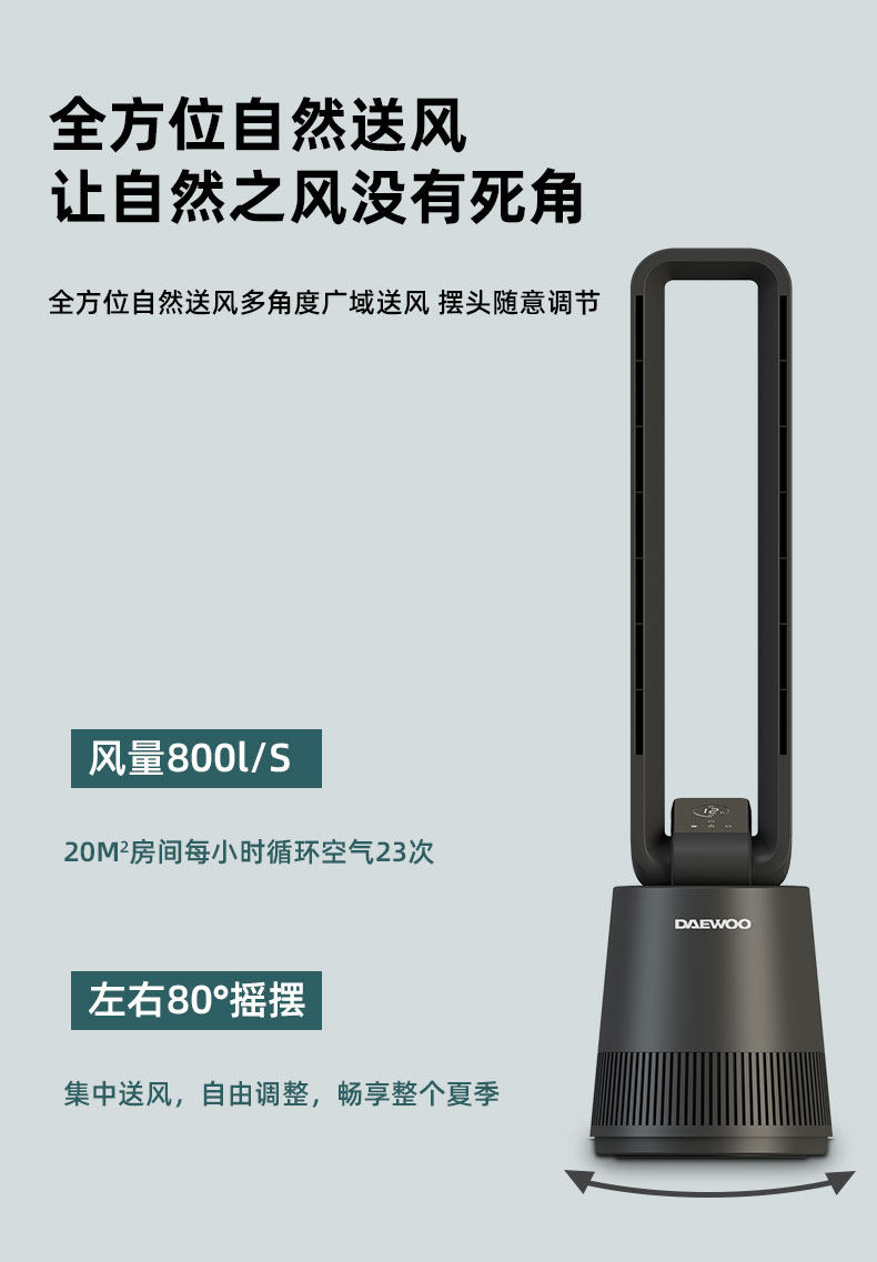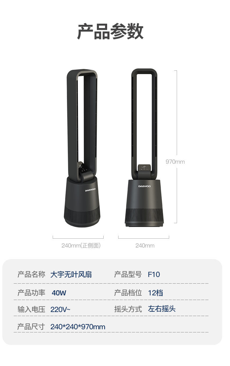 商品属性 [品牌 ] DAEWOO/大宇 [型号 ] DAEWOO-F15 [产地 ] 宁波 [颜色分类 ] F10 · 深空灰(2020新款) F15 [生产企业 ] 宁波柏宇电器有限公司 [附加功能 ] 旋转 净化空气 [控制方式 ] 遥控式 [尺寸 ] 215x215x1047mm [净重 ] 4.7kg [智能类型 ] 其他智能 [适用面积 ] 200㎡ [噪声 ] 50dB [功率 ] 35W [保修期 ] 5年
