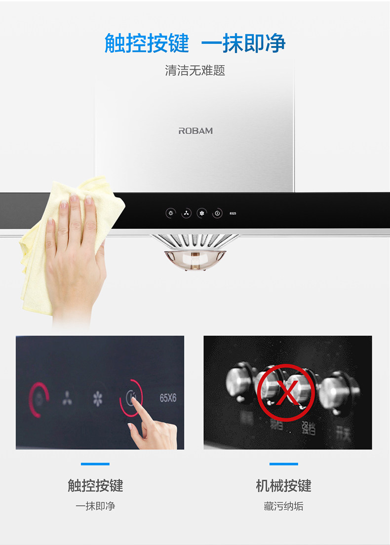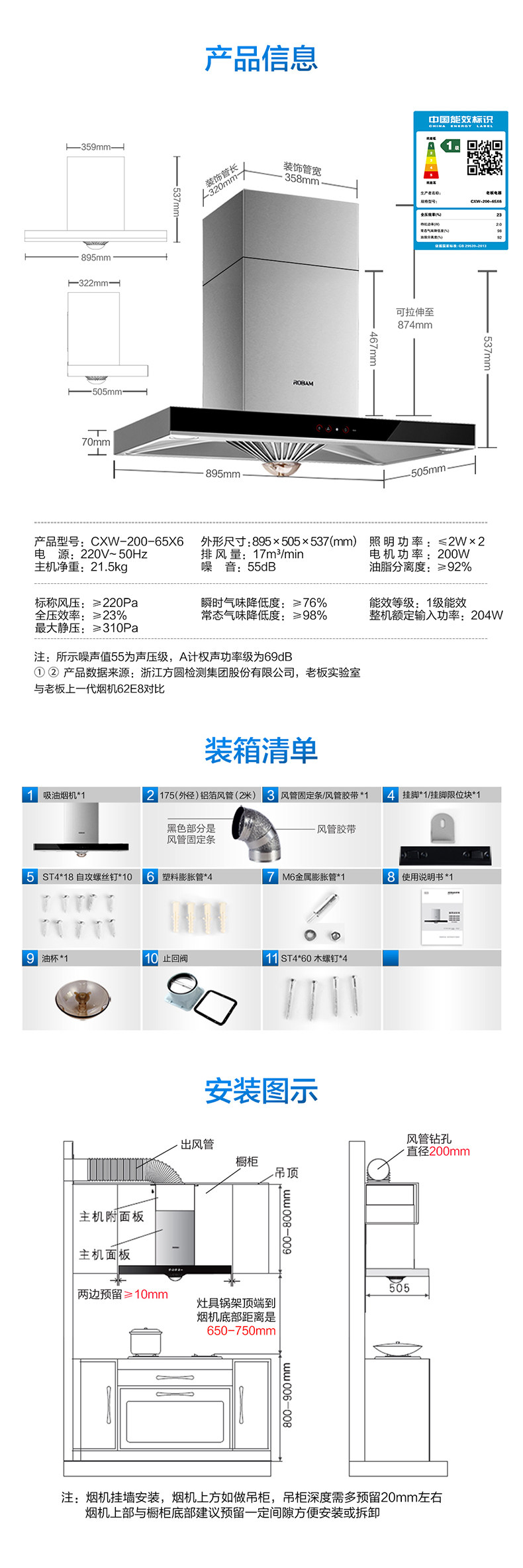 商品属性 [油烟机品牌 ] Robam/老板 [老板烟机气灶型号 ] CXW-200-65X6 [产地 ] 中国大陆 [尺寸 ] 895x505x537mm [颜色分类 ] 不锈钢色 [净重 ] 21.5kg [毛重 ] 30kg [烟机安装位置 ] 顶吸式 [机身材质 ] 不锈钢 [包装尺寸 ] 985x635x627mm [生产企业 ] 杭州老板电器股份有限公司 [油烟机种类 ] 欧式 [按键类型 ] 触控式 [控制面板材质 ] 钢化玻璃 [堆码层数极限 ] 6层 [智能类型 ] 阿里智能 [油烟机排风量 ] 17立方米/分钟 [噪声 ] 69dB [上市时间 ] 2015-6 [保修期 ] 60个月