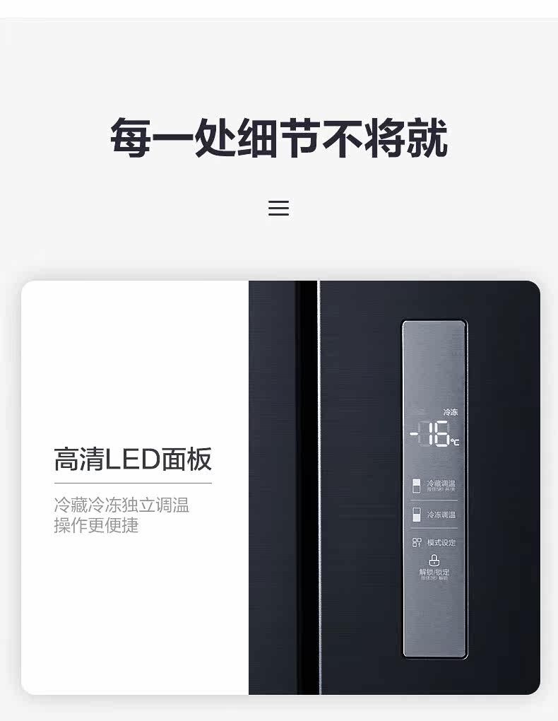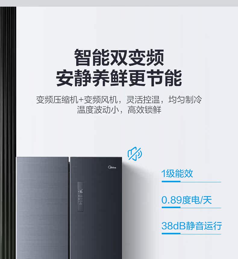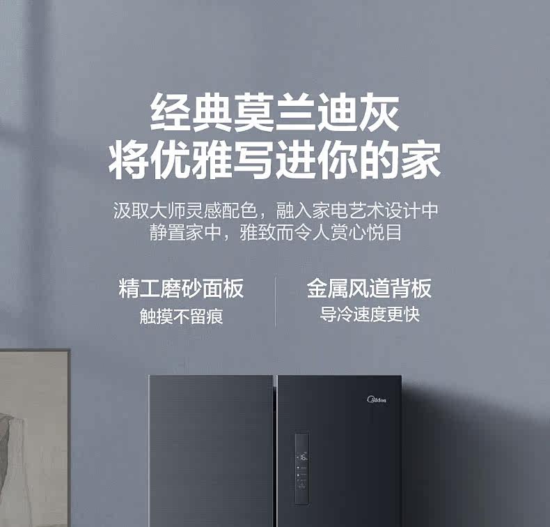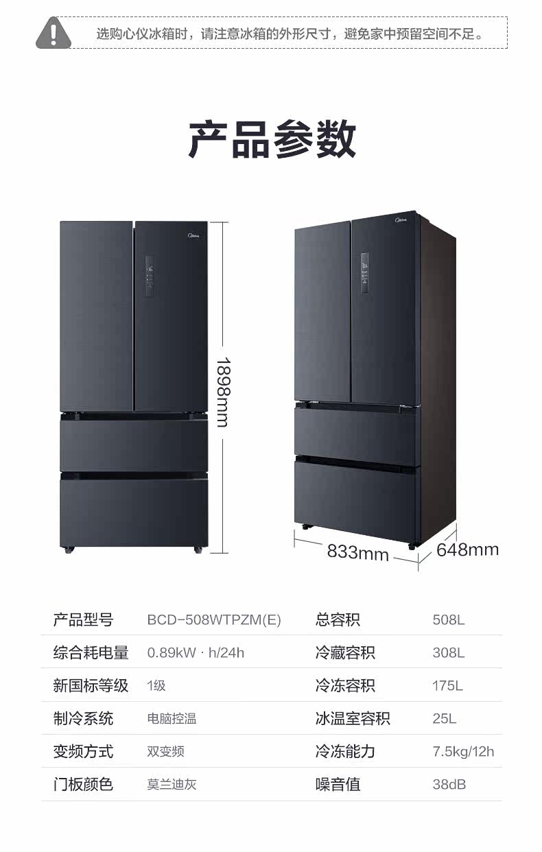 商品属性 [冰箱冰柜品牌 ] Midea/美的 [美的冰箱型号 ] BCD-508WTPZM(E) [售后服务 ] 全国联保 [产地 ] 中国大陆 [省份 ] 安徽省 [地市 ] 合肥市 [面板类型 ] VCM覆膜板 [制冷方式 ] 风冷 [颜色分类 ] 莫兰迪灰 [箱门结构 ] 多门式 [冰箱冷柜机型 ] 冷藏冷冻冰箱 [制冷控制系统 ] 电脑温控 [同城服务 ] 同城物流送货上门 [能效等级 ] 一级 [是否变频 ] 变频 [堆码层数极限 ] 3层 [毛重 ] 114kg [包装尺寸 ] 896x710x2010mm [宽×深(厚)×高 ] 833x648x1898mm [净重 ] 104kg [宽度 ] 833mm [智能类型 ] 其他智能 [最大容积 ] 508L [冷冻室容积 ] 175L [噪声 ] 38dB [耗电量 ] 0.89Kwh/24h [上市时间 ] 2019-07 [冷藏室容积 ] 308L [总容量 ] 508L [能效备案号 ] 201903-1-10813-3578994104104 [采购地 ] 中国大陆 [总容量范围 ] 501-600升 [深度 ] 648mm [高度 ] 1898mm [保修期 ] 12个月