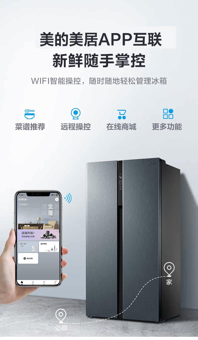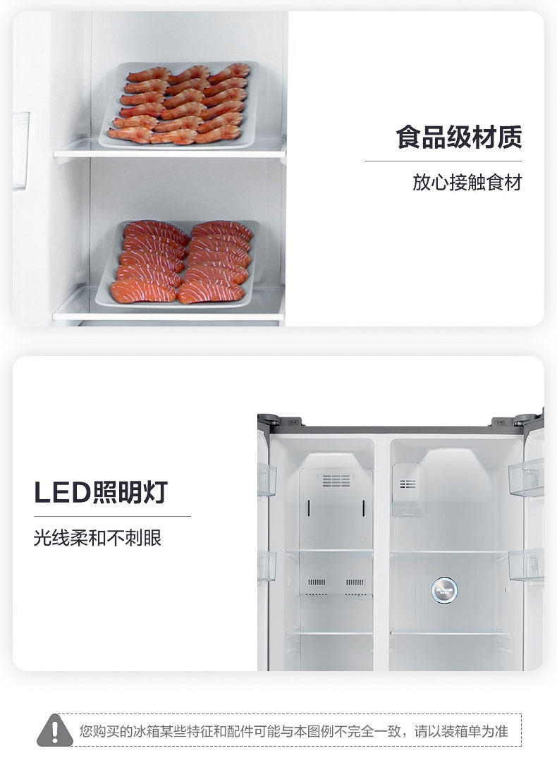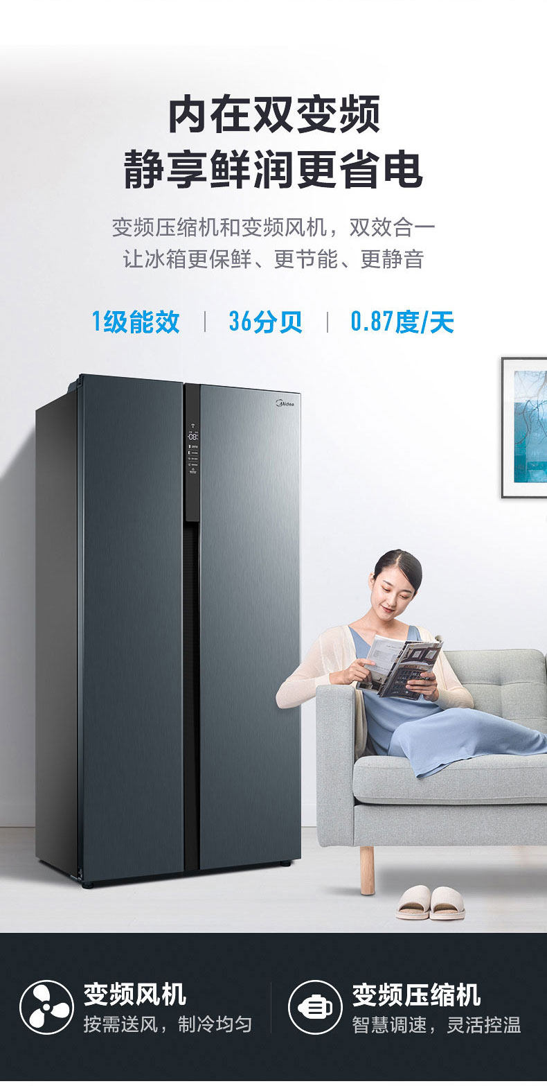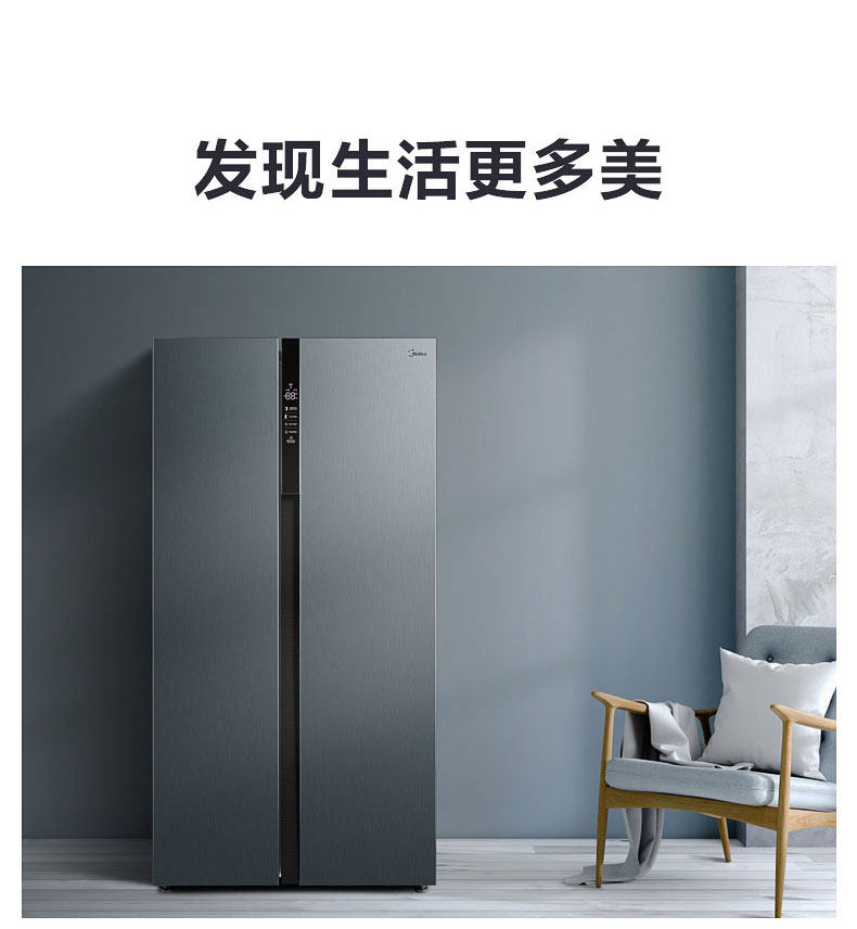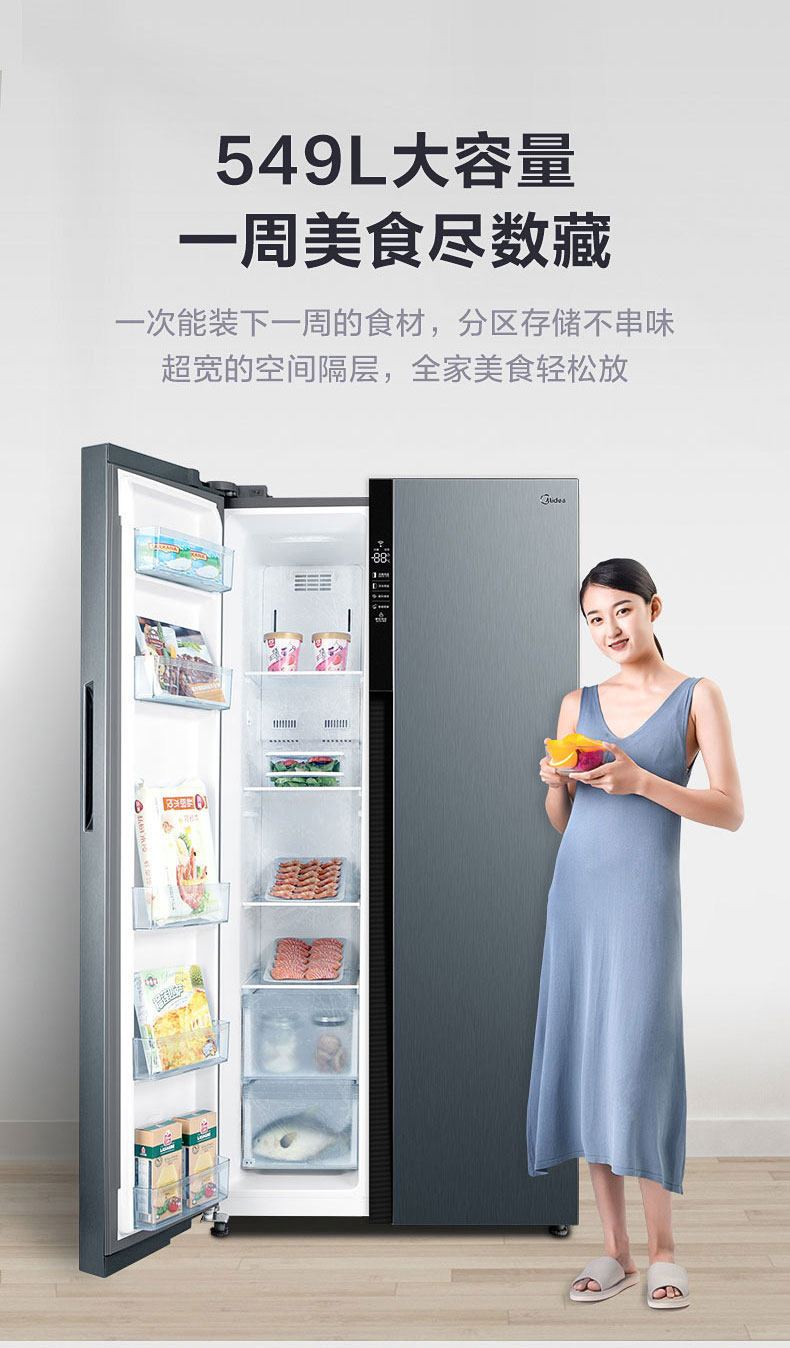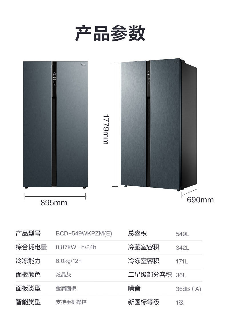 商品属性 [冰箱冰柜品牌 ] Midea/美的 [美的冰箱型号 ] BCD-549WKPZM(E) [售后服务 ] 全国联保 [产地 ] 中国大陆 [省份 ] 安徽省 [地市 ] 合肥市 [面板类型 ] VCM覆膜板 [制冷方式 ] 风冷 [颜色分类 ] 炫晶灰 [箱门结构 ] 对开双门式 [冰箱冷柜机型 ] 冷藏冷冻冰箱 [制冷控制系统 ] 电脑温控 [同城服务 ] 同城物流送货上门 [能效等级 ] 一级 [是否变频 ] 变频 [堆码层数极限 ] 3层 [毛重 ] 98kg [包装尺寸 ] 963x755x1870mm [宽×深(厚)×高 ] 895x690x1779mm [净重 ] 88kg [宽度 ] 895mm [智能类型 ] 其他智能 [最大容积 ] 549L [冷冻室容积 ] 171L [噪声 ] 36dB [耗电量 ] 0.87Kwh/24h [上市时间 ] 2019-08 [冷藏室容积 ] 342L [总容量 ] 549L [能效备案号 ] 201907-1-10813-3910700950623 [采购地 ] 中国大陆 [总容量范围 ] 501-600升 [深度 ] 690mm [高度 ] 1779mm [保修期 ] 12个月