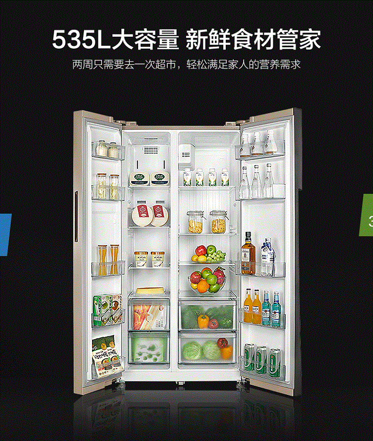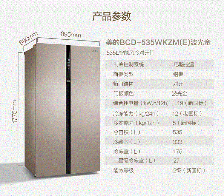 商品属性 [冰箱冰柜品牌 ] Midea/美的 [美的冰箱型号 ] BCD-535WKZM(E) [产地 ] 中国大陆 [省份 ] 安徽省 [地市 ] 合肥市 [面板类型 ] VCM覆膜板 [制冷方式 ] 风冷 [颜色分类 ] 521升无霜经济实惠款,535升智能无霜款,535升智能变频无霜款 [箱门结构 ] 对开双门式 [冰箱冷柜机型 ] 冷藏冷冻冰箱 [制冷控制系统 ] 电脑温控 [能效等级 ] 二级 [是否变频 ] 非变频 [堆码层数极限 ] 2层 [毛重 ] 102kg [包装尺寸 ] 960x755x1870mm [宽×深(厚)×高 ] 895x690x1775mm [净重 ] 92kg [宽度 ] 895mm [智能类型 ] 其他智能 [最大容积 ] 535L [冷冻室容积 ] 192L [噪声 ] 39dB [耗电量 ] 1.19Kwh/24h [上市时间 ] 2015-9 [冷藏室容积 ] 343L [总容量 ] 535L [能效备案号 ] 201611-1-10813-980190756571 [采购地 ] 中国大陆 [总容量范围 ] 501-600升 [深度 ] 690mm [高度 ] 1775mm [保修期 ] 12个月