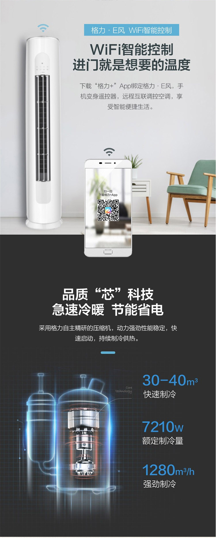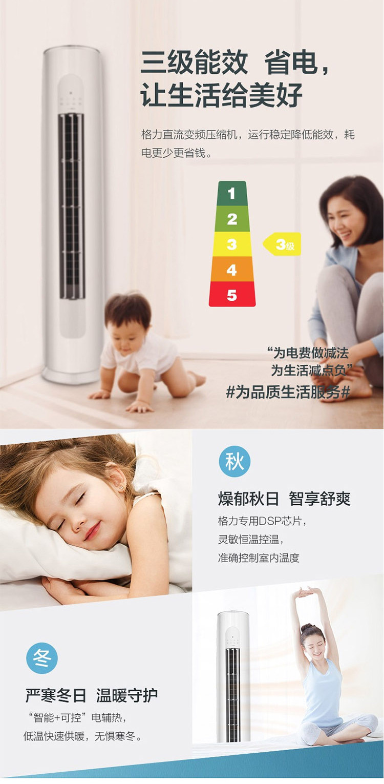 商品属性 [空调品牌 ] Gree/格力 [格力空调型号 ] KFR-72LW/(72530)FNhAa-A3(WIFI) [空调功率 ] 3匹 [工作方式 ] 变频 [空调类型 ] 柜机 [冷暖类型 ] 冷暖电辅 [空调面板颜色 ] 月影白 [适用面积 ] 30-40㎡ [能效等级 ] 三级 [室外机净质量 ] 48kg [室内机净质量 ] 29.5kg [内机堆码层数极限 ] 5层 [外机堆码层数极限 ] 4层 [内机尺寸 ] 1810x372x403mm [外机包装尺寸 ] 1028x455x745mm [外机尺寸 ] 955x396x700mm [内机毛重 ] 40.5kg [内机包装尺寸 ] 2066x462x485mm [外机毛重 ] 55kg [智能类型 ] 不支持智能 [制热功率 ] 3150W [制热量 ] 9300W [制冷量 ] 7210W [室内机噪音 ] 46dB [室外机噪音 ] 56dB [制冷功率 ] 2410W [上市时间 ] 2019-11 [电辅加热功率 ] 1800W [能效备案号 ] 201907-10-324-3866756566328 [保修期 ] 72个月