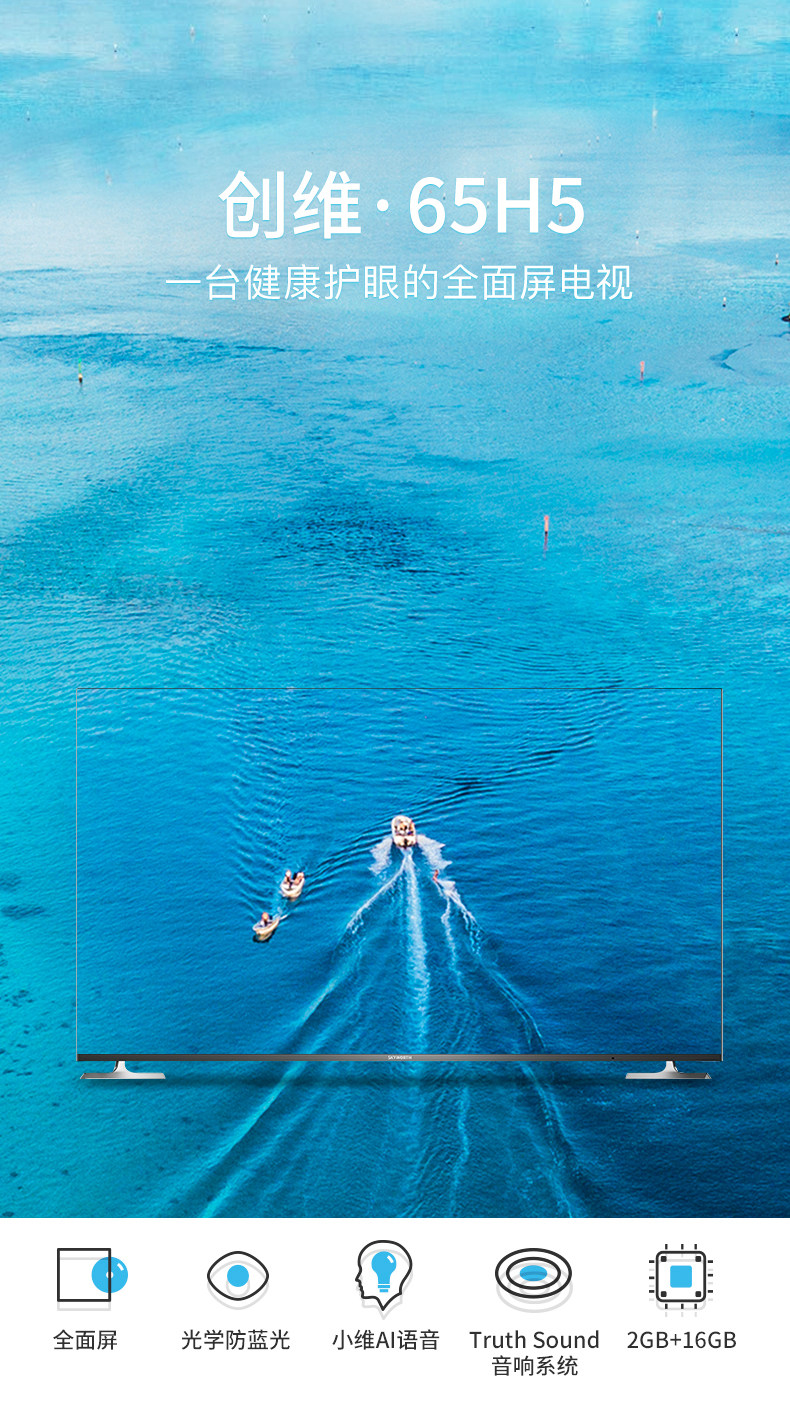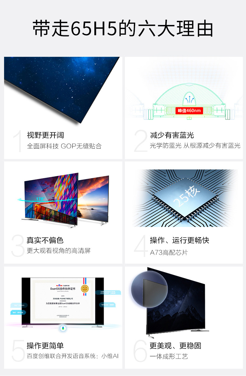 商品属性 [品牌 ] Skyworth/创维 [创维LED型号 ] 65H5 [运行内存 ] 2GB [售后服务 ] 其他/other [屏幕比例 ] 16:9 [接口类型 ] HDMI USB RF输入、视频输入、网络端口 [分辨率 ] 3840×2160 [颜色分类 ] 黑色 [同城服务 ] 同城上门安装 [套餐类型 ] 官方标配 [存储内存 ] 16GB [能效等级 ] 三级 [背光灯类型 ] LED发光二极管 [电视类型 ] LED背光源电视 [网络连接方式 ] 全部支持 [扫描方式 ] 逐行扫描 [接收制式 ] PAL NTSC [操作系统名称 ] 酷开系统 [操作系统 ] 酷开系统 [HDMI接口数量 ] 2个 [视频显示格式 ] 2160p [3D类型 ] 否 [主机尺寸(不含底座)mm ] 1447×88×829 [堆码层数极限 ] 3层 [毛重 ] 23.5kg [包装尺寸 ] 1600x185x955mm [上市时间 ] 2018-09 [屏幕尺寸 ] 65英寸 [净重(不含底座) ] 16.5kg [含边框整屏尺寸 ] 1447x88x829mm [净重(含底座) ] 17kg [能效备案号 ] 201809-22-601-3254589998363 [电视形态 ] 平板